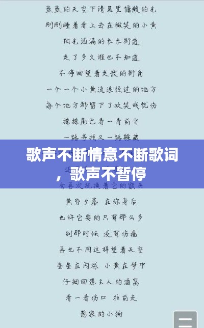 在音乐的世界里,歌声是永恒的旋律,情意是不断绵延的纽带。无论是欢快的节奏还是深情的旋律,歌声都在不断地传递着人们的情感。一首好的歌词,能够让人在歌声中找到共鸣,感受到那份不断流淌的情意。