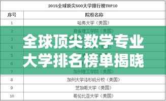 数学作为自然科学的重要分支,其研究与应用领域广泛,吸引了众多学子投身其中,全球各大高校在数学领域的研究实力与成果各有千秋,本文为您介绍全球大学数学专业排名前十名,以供参考。