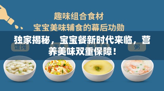 我们独家推出的宝宝餐是新时代婴幼儿饮食的代表作,它将为宝宝的健康成长提供有力保障,让我们共同期待宝宝餐的新时代来临!