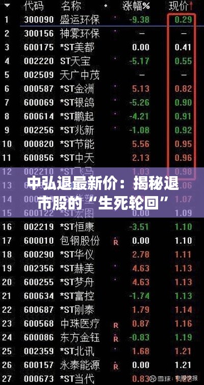 3. 退市股的交易风险高 退市股的交易风险较高,投资者应谨慎对待。中弘退的退市后交易,投资者需密切关注其基本面变化,以规避风险。 ### 总结 中弘退的最新股价动态,揭示了退市股的“生死轮回”。投资者在投资退市股时,应充分了解退市原因、股价波动特点以及交易风险,以规避潜在的投资风险。同时,退市股的退市历程也提醒我们,企业应注重自身经营,避免陷入退市困境。