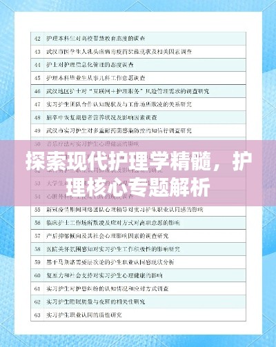 护理核心专题是指反映护理学本质、具有广泛性和重要性的研究领域,这些领域涵盖了护理实践、护理理论、护理管理、护理教育等多个方面,是提升护理质量、改善患者体验的关键所在。