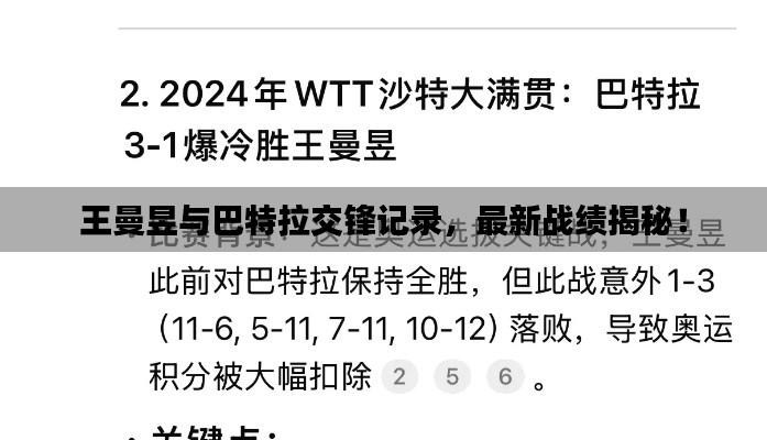 乒乓球界备受瞩目的焦点之一便是王曼昱和巴特拉的对决,两位选手都是当今乒坛的佼佼者,他们的每一次交手都备受关注,本文将为大家介绍王曼昱和巴特拉最新交手记录,带您领略这场激烈的对决。