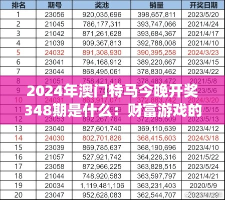 转载请注明来自成都华通顺物流有限公司,本文标题:《2024年澳门特马今晚开奖348期是什么:财富游戏的再次启动》