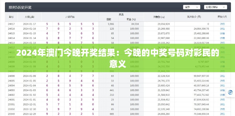 今晚的中奖号码对彩民来说是意义非凡的,它既关系到彩民们的实际利益,也是彩票事业发展的重要体现。接下来我们将详细分析中奖号码对彩民的意义,帮助彩民朋友们更好地了解彩票开奖的价值所在。