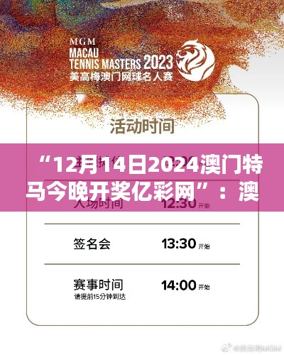 随着澳门的娱乐和博彩业蓬勃发展,各种引人注目的活动繁多。今日,我们特别关注“12月14日2024澳门特马今晚开奖亿彩网”:澳门特马,今晚的焦点。亿彩网作为澳门重要的彩票信息平台之一,为广大彩民提供了全面、便捷的信息服务。我们撰写此文,旨在让读者对本次澳门特马有所了解,并对澳门特马这一活动产生兴趣。