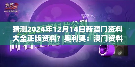 澳门,中国南部的一颗璀璨明珠,因其独特的历史和文化背景,成为了一个国际旅游和休闲娱乐的最佳目的地。随着时代的发展,澳门正以史无前例的速度迅猛发展,不断涌现的新资料和信息为研究澳门提供了宝贵的资料来源。这篇文章旨在对2024年12月14日发布的《新澳门资料大全正版资料》进行一番猜测和展望,探索其可能涵盖的内容和价值所在,即奥利奥:澳门资料的丰富性和多样性。