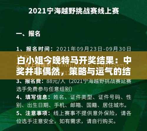 彩票作为一种获奖的概率游戏,在澳门特别行政区受到了广泛的关注和参与。在众多澳门彩票游戏当中,“白小姐今晚特马”一档开奖节目无疑占据了非常重要的地位。许多彩民不仅希望能从节目获取开奖号码,更抱有能够赢得巨额奖金的梦想。但霸王今晚特马开奖结果真的只是偶然吗?本文将为您揭秘背后的中奖秘诀:技巧与运气的结合。